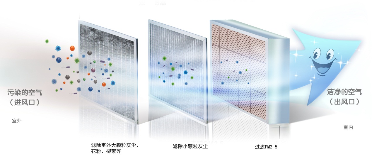 機(jī)組配備新風(fēng)過濾段,向室內(nèi)送入新鮮空氣的同時(shí),對(duì)送入的空氣進(jìn)行凈化處理。機(jī)組采用先進(jìn)除塵技術(shù),有效過濾空氣中的粉塵、微小顆粒物和PM2.5,為用戶提供醫(yī)療級(jí)凈化新風(fēng)。