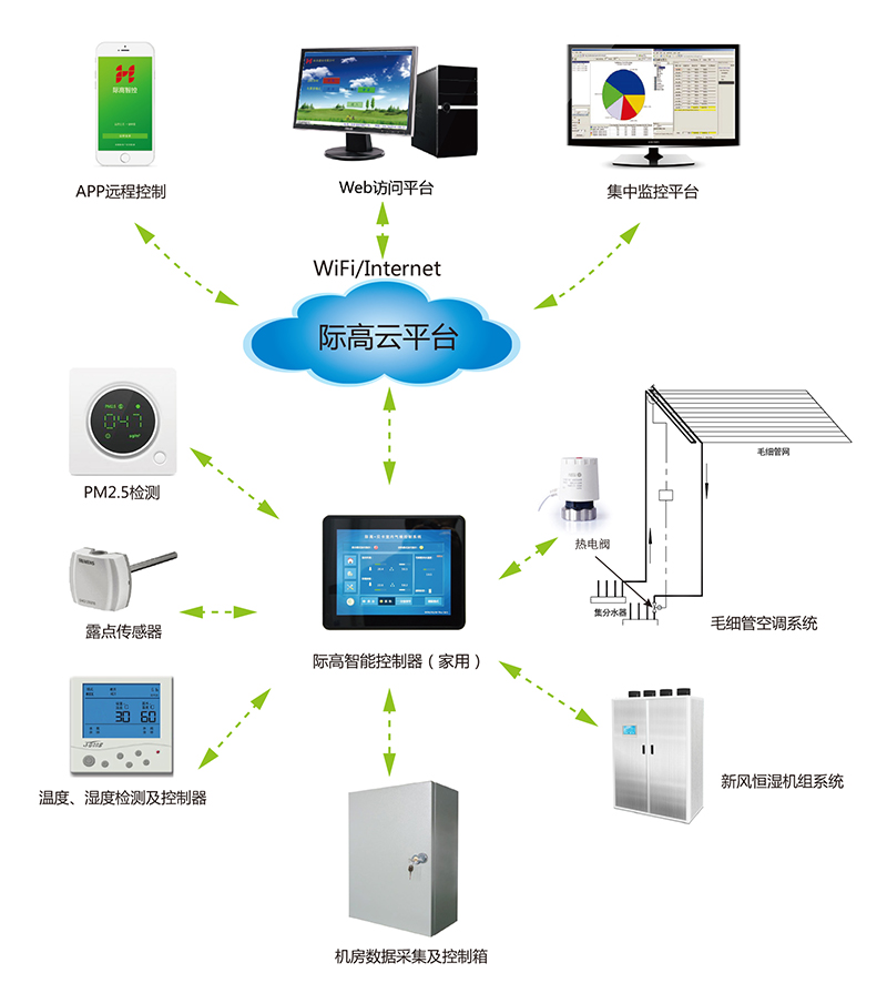 際高智能檢測(cè)與控制系統(tǒng),通過安裝在室內(nèi)的露點(diǎn)監(jiān)控、PM2.5監(jiān)測(cè)、二氧化碳濃度監(jiān)測(cè)、開窗監(jiān)測(cè)等監(jiān)測(cè)裝置,及時(shí)掌握室內(nèi)氣候狀況,通過室內(nèi)安裝的“際高智能控制器”或者手機(jī)APP,實(shí)現(xiàn)對(duì)毛細(xì)管輻射系統(tǒng)的水溫、流量進(jìn)行控制,對(duì)新風(fēng)系統(tǒng)的風(fēng)量、新風(fēng)濕度、潔凈度進(jìn)行調(diào)節(jié),確保健康、舒適的室內(nèi)氣候環(huán)境。際高智能檢測(cè)與控制系統(tǒng)如下圖:
